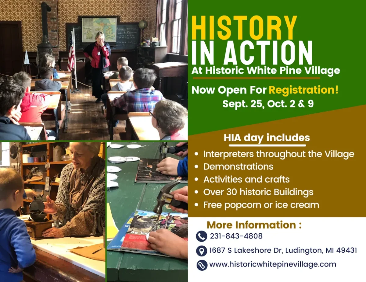 Come explore Historic White Pine Village like never before! History in Action is a special event series that brings the village to life with costumed interpreters, live demonstrations, and hands-on activities for all ages. Whether you’re watching a blacksmith at work, trying your hand at old-fashioned crafts, or sitting in a one-room schoolhouse, you’ll feel transported to another time.